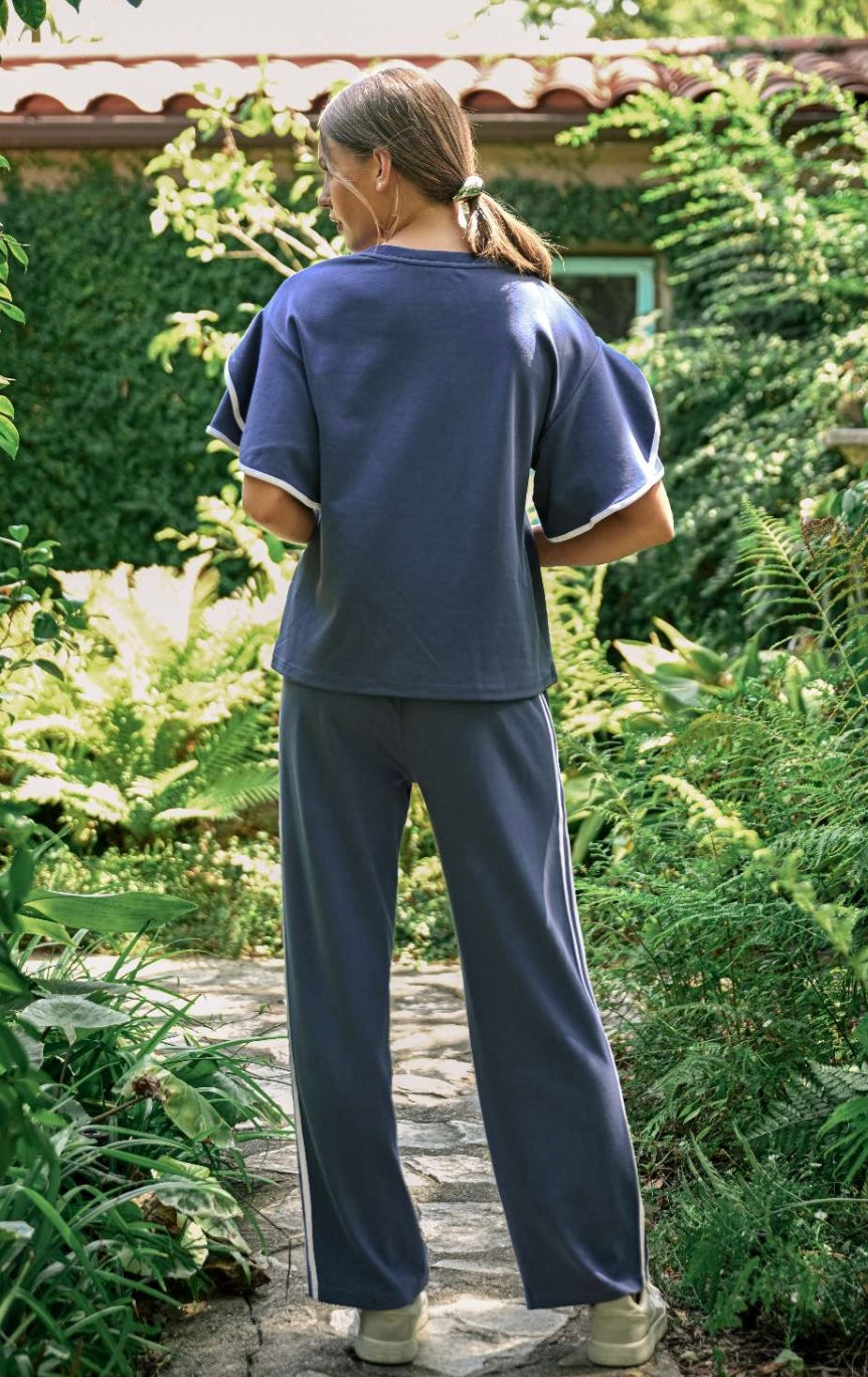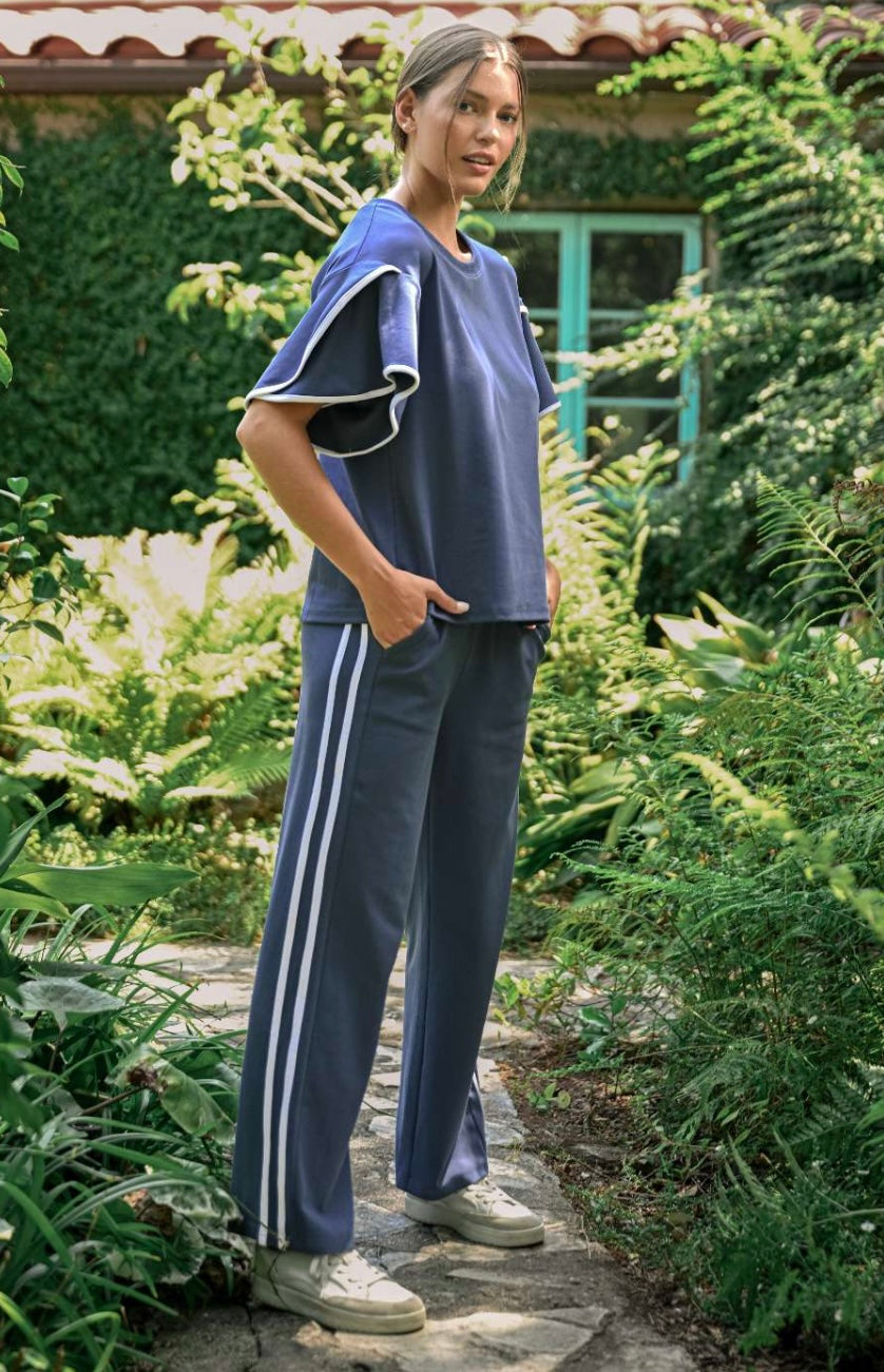 Elevate your active wardrobe with this navy and white dressy set that seamlessly blends style with function. The ruffle sleeve top adds a playful, sporty flair that catches the eye, while practical pockets on the matching pants keep your essentials within reach. Perfect for workouts, casual outings, or anyone who refuses to compromise between looking polished and feeling comfortable. This versatile set proves that athletic wear can be both fashionable and functional.sold as a set.