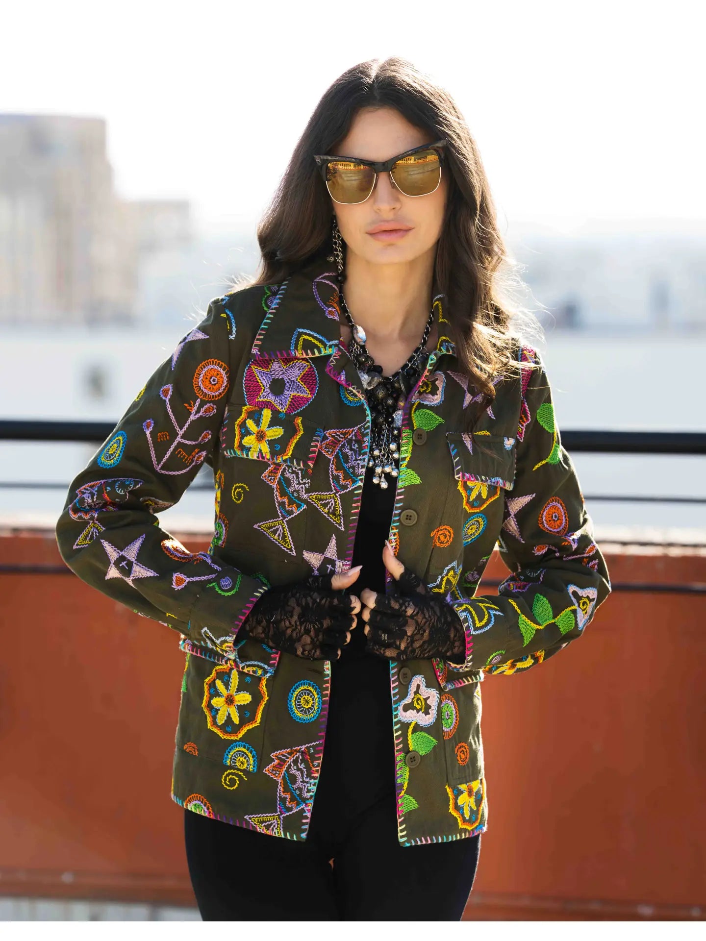 Elevate your everyday style with this striking army green utility jacket, designed for those who refuse to blend in. Featuring bold embroidered detailing that adds character and dimension, this versatile piece transitions seamlessly from casual outings to weekend adventures. The structured silhouette and functional design make it a wardrobe essential that works as hard as you do. Perfect for layering or wearing solo, this jacket combines rugged appeal with refined craftsmanship. Make a statement with a piece that's as confident and capable as you are.