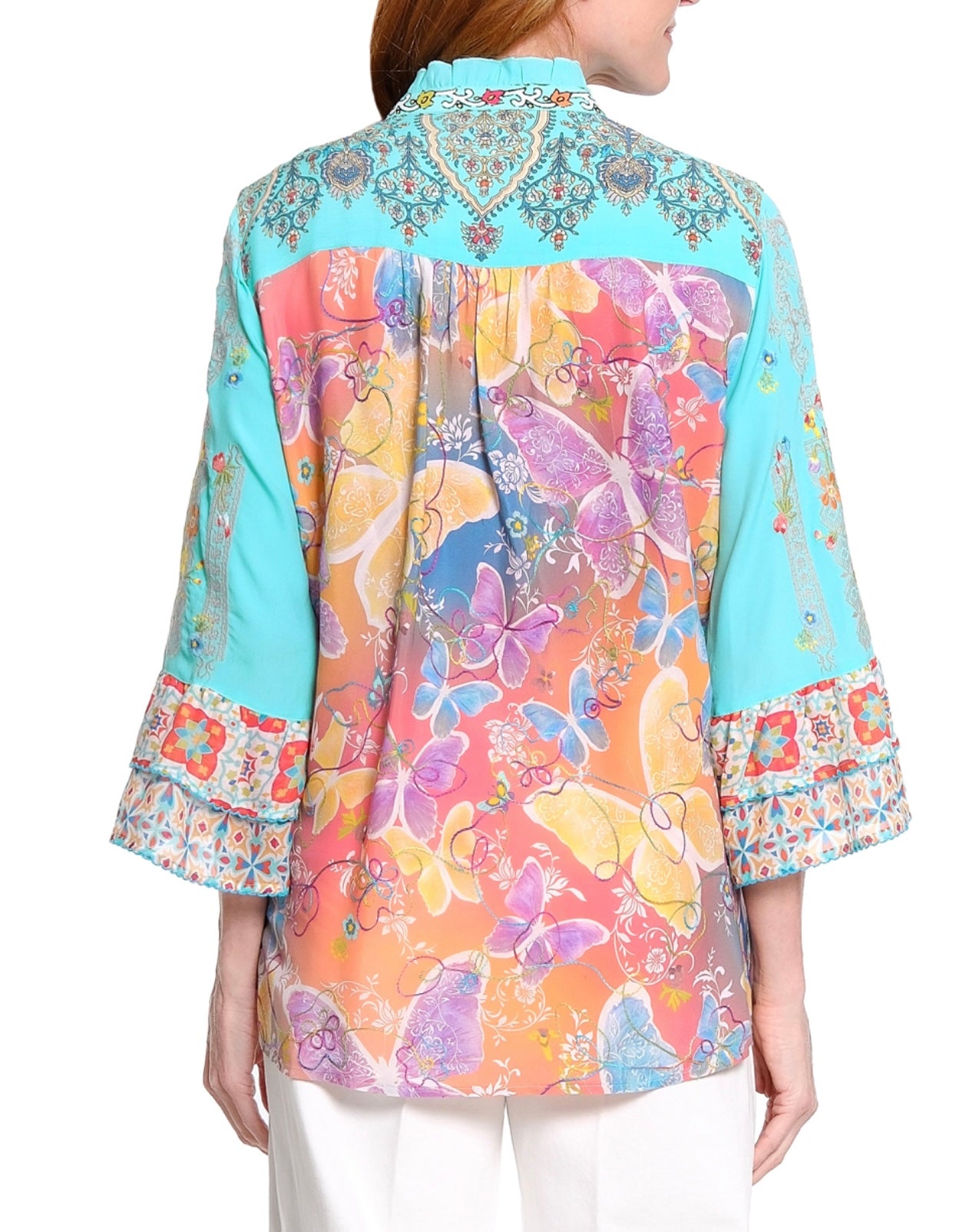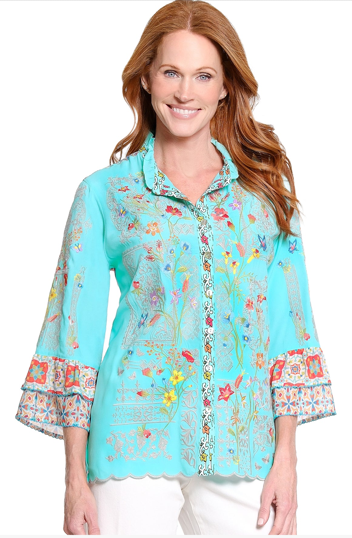 Elevate your wardrobe with this stunning floral turquoise blouse, where timeless elegance meets modern style. Featuring delicate embroidered details and charming ruffle cuffs on the sleeves, this beautiful top brings sophistication to any occasion. The intricate embroidery adds texture and visual interest, while the ruffled sleeves create a feminine, polished look perfect for dressing up or down. Crafted for comfort and style, this blouse is an essential piece that transitions seamlessly from office to evening wear.