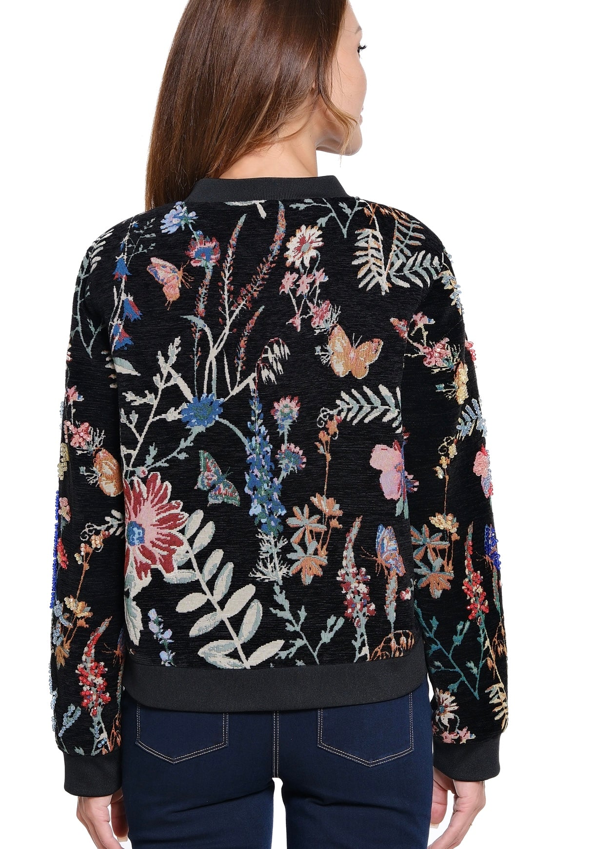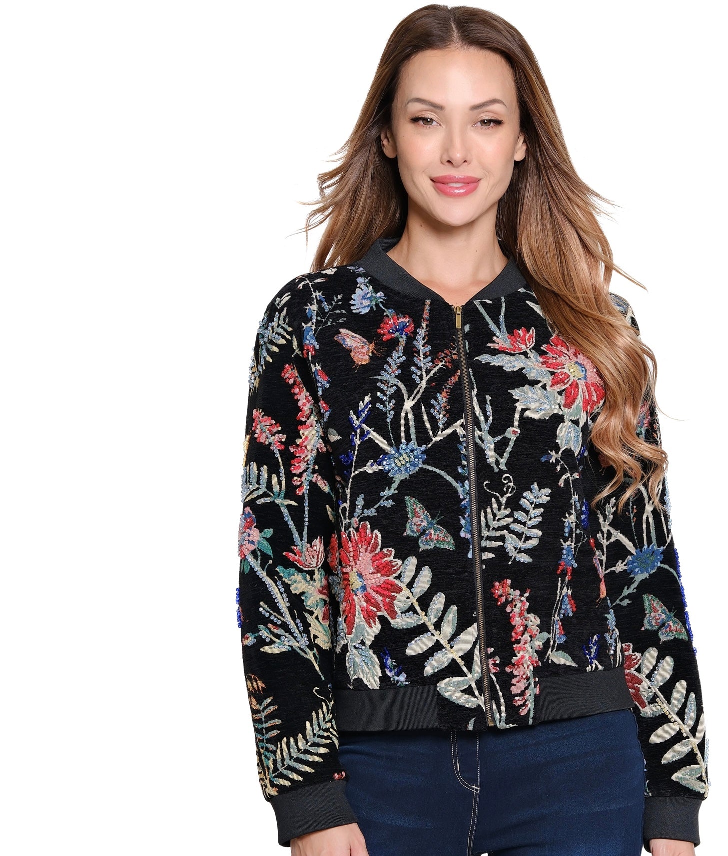 Elevate your style with the John Mark Beaded Jacket, featuring intricate floral beading and a sleek zipper front. This black jacket merges girly charm with an edgy attitude, perfect for standing out day or night. Its detailed craftsmanship and flattering fit make it a must-have statement piece for anyone looking to express confidence and flair.