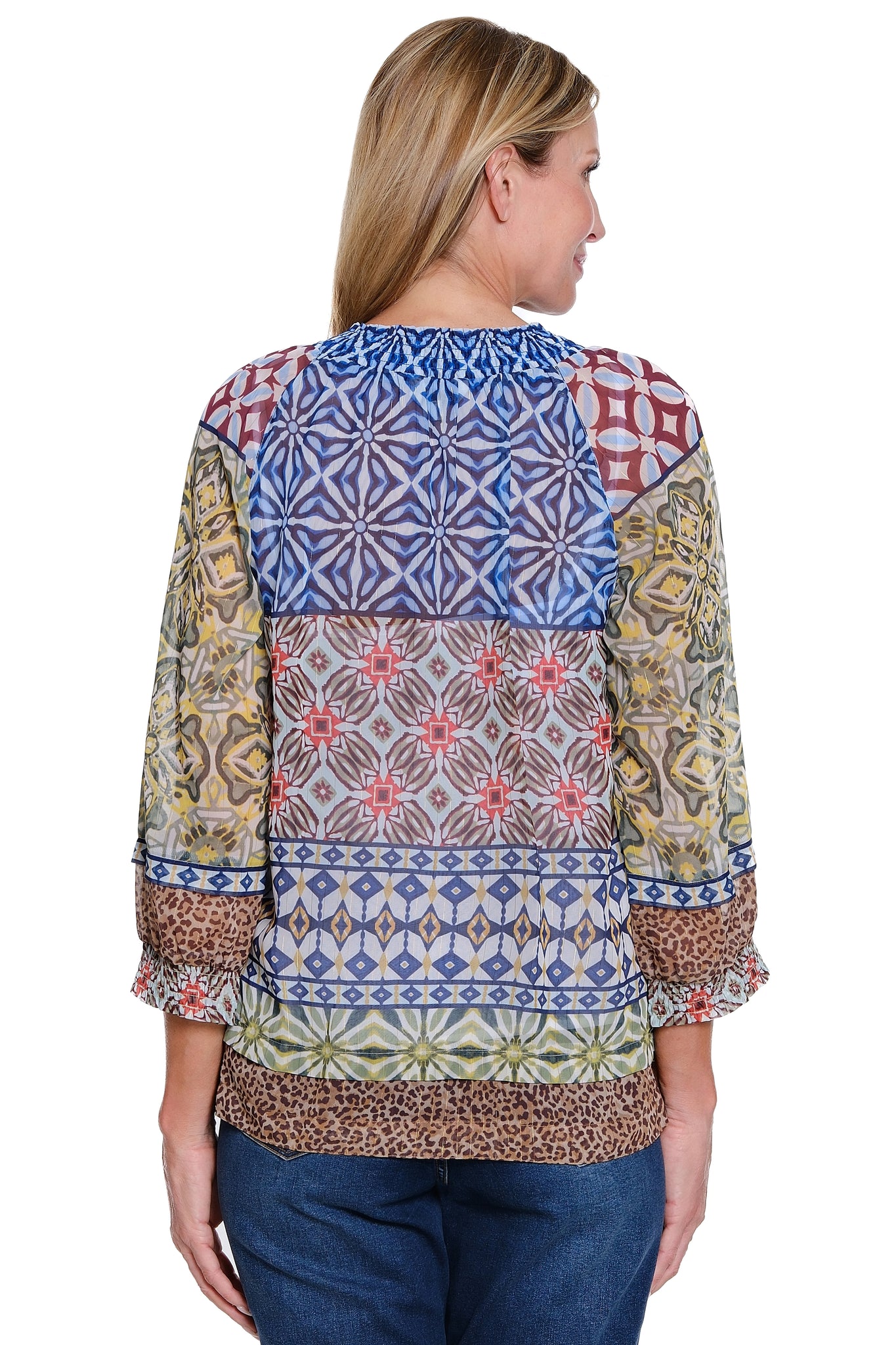 Elevate your wardrobe with the John Mark Fleur De Lis blouse. Featuring delicate gold thread woven throughout, this sheer fall top combines elegance and subtle shimmer. Its flowing silhouette offers comfort and sophistication, making it perfect for any occasion where you want to stand out effortlessly.