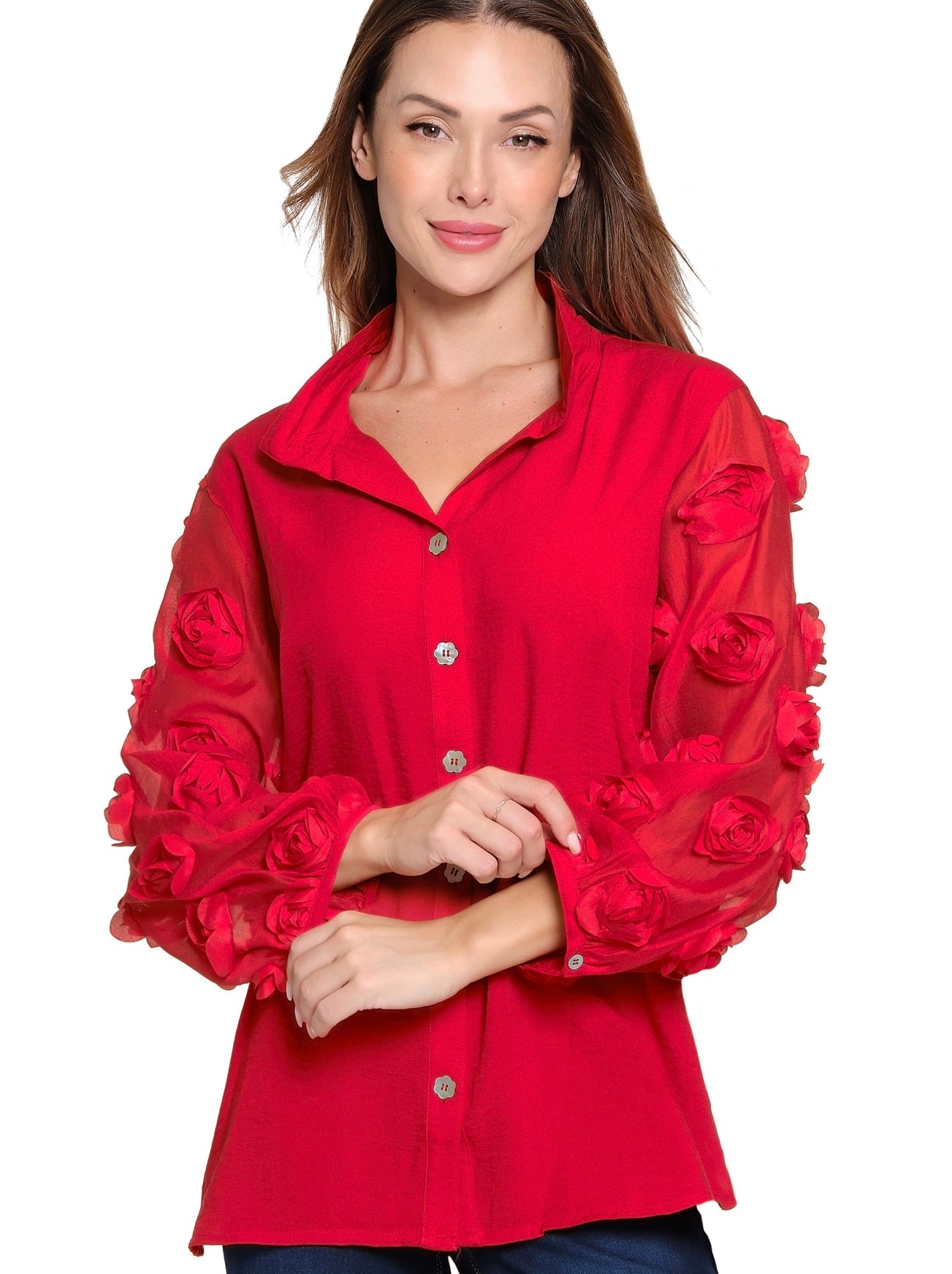 Elevate your style with the John Mark Red Button Up Blouse, featuring elegant rose details on the sleeves. This vibrant blouse pairs effortlessly with any outfit, adding a touch of fun and sophistication. Perfect for dressing up, it brings a fresh, confident flair to your wardrobe.