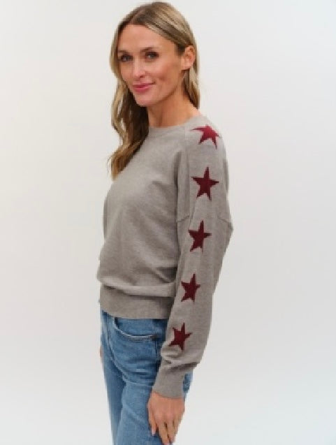 Elevate your casual look with the Maddy Star Graphic Sleeve Sweater by Six Fifty. This lightweight sweater in heather light brown features cream star patterns along the sleeves, adding a playful yet stylish touch. Perfect for layering or wearing on cooler days, its soft fabric ensures comfort without bulk. Stand out effortlessly with this versatile piece that combines cozy warmth and starry charm.pictured on model color not available . Brown with cream as pictured available.