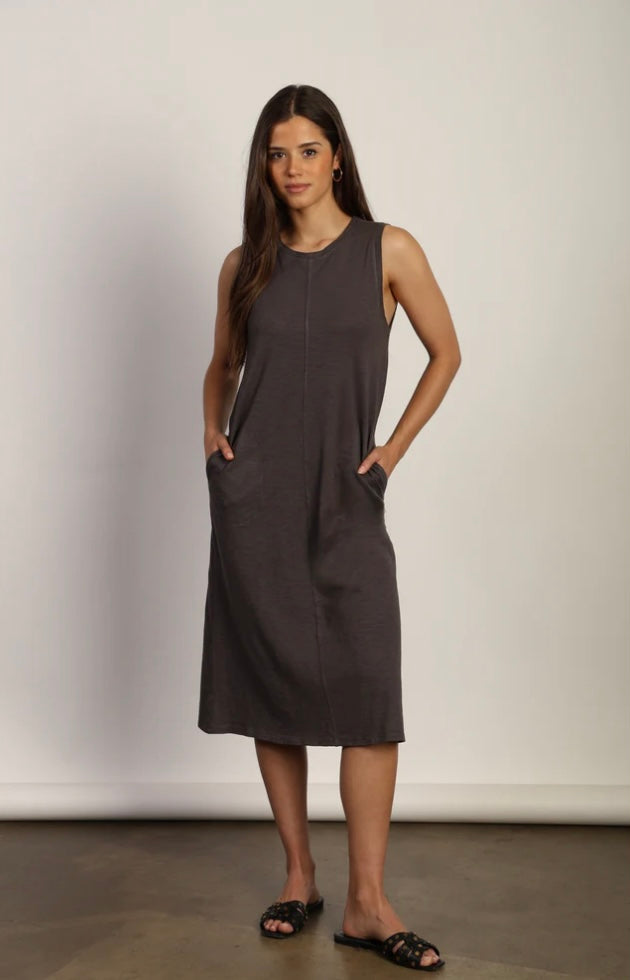 The Mia Dress combines effortless style with everyday comfort. This charcoal tank dress features a relaxed fit perfect for warm weather, crafted from soft cotton that feels gentle against your skin. Practical side pockets add functionality to this versatile piece, making it ideal for casual outings, weekend errands, or laid-back gatherings. Slip it on and go—a wardrobe essential that works as hard as you do.