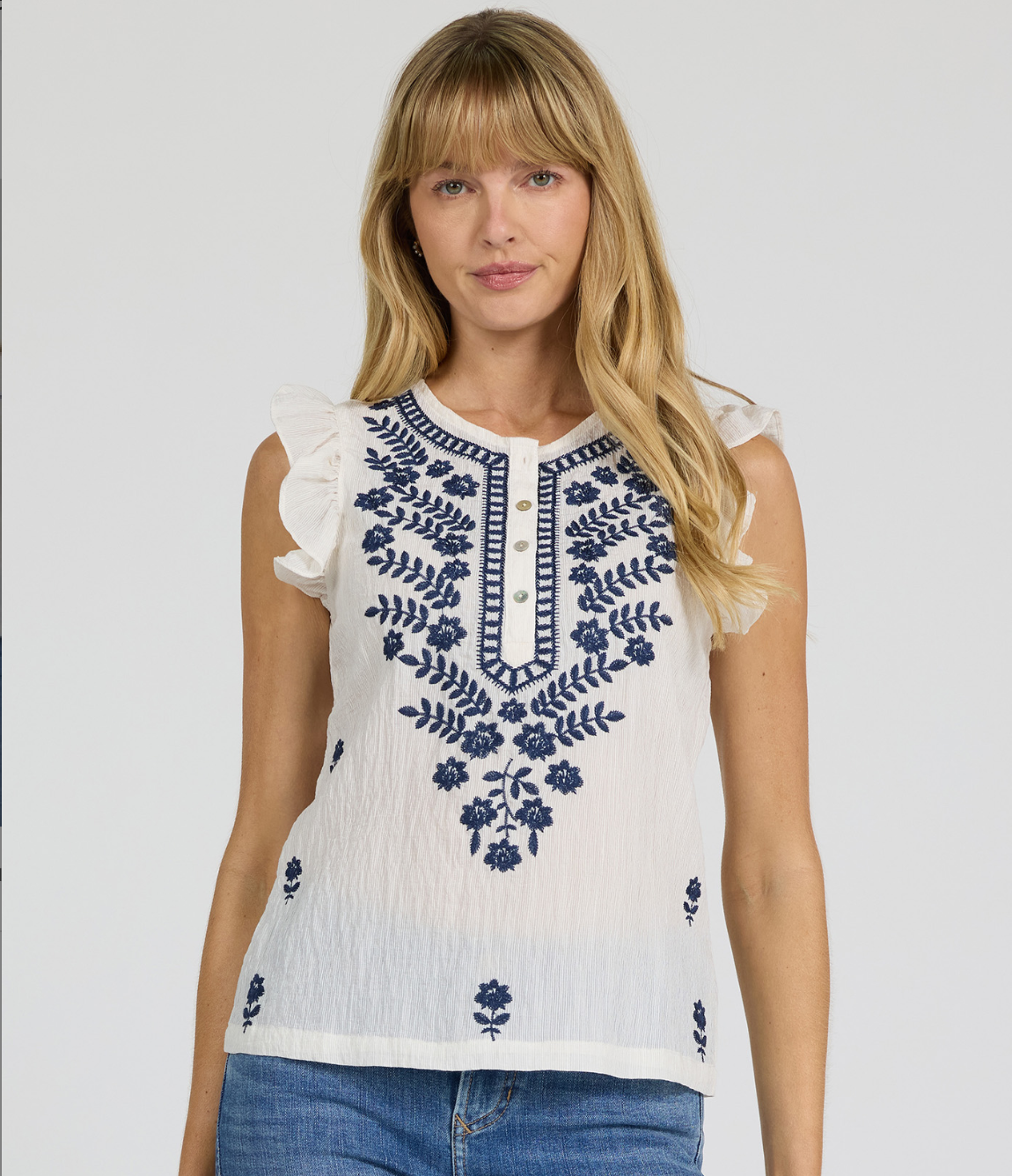 The Nicola Top is a lightweight, breathable essential perfect for layering or wearing solo. Featuring delicate ruffle cap sleeves and navy stitching details, this piece brings an effortless feminine touch to any wardrobe. The thin, airy fabric makes it ideal for warm weather styling, while the refined design works seamlessly from casual days to dressed-up occasions. A versatile staple that transitions beautifully across seasons.