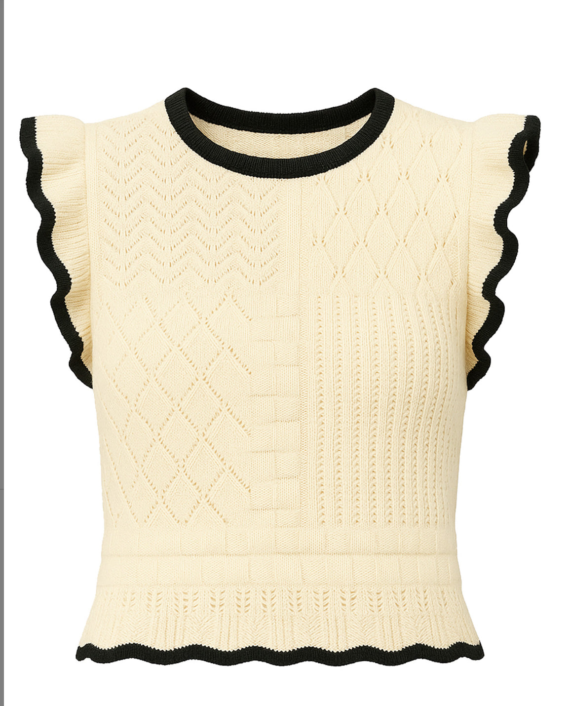 Elevate your wardrobe with the Nikita Crochet Top, a charming piece that combines delicate craftsmanship with modern style. Featuring intricate crochet detailing and eye-catching ruffle sleeves, this top brings texture and movement to any outfit. The sleek black trim adds a sophisticated contrast that frames the design beautifully. Perfect for layering or wearing solo, this versatile piece transitions seamlessly from casual days to special occasions. Discover the perfect balance of comfort and elegance with this must-have addition to your collection.