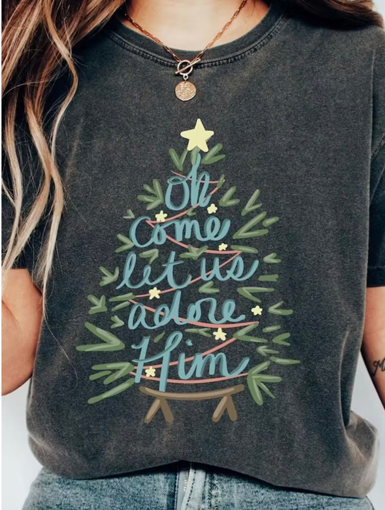 Celebrate the season with timeless elegance in this classic black Christmas tee. Featuring the beloved hymn "Oh Come Let Us Adore Him," this shirt combines spiritual meaning with everyday comfort. Perfect for holiday gatherings, church events, or cozy winter days, it's a versatile piece that lets your faith shine through. Soft, durable fabric ensures all-day wearability, while the understated design pairs effortlessly with any outfit. Make this meaningful tee your go-to choice for spreading Christmas joy with style and substance.