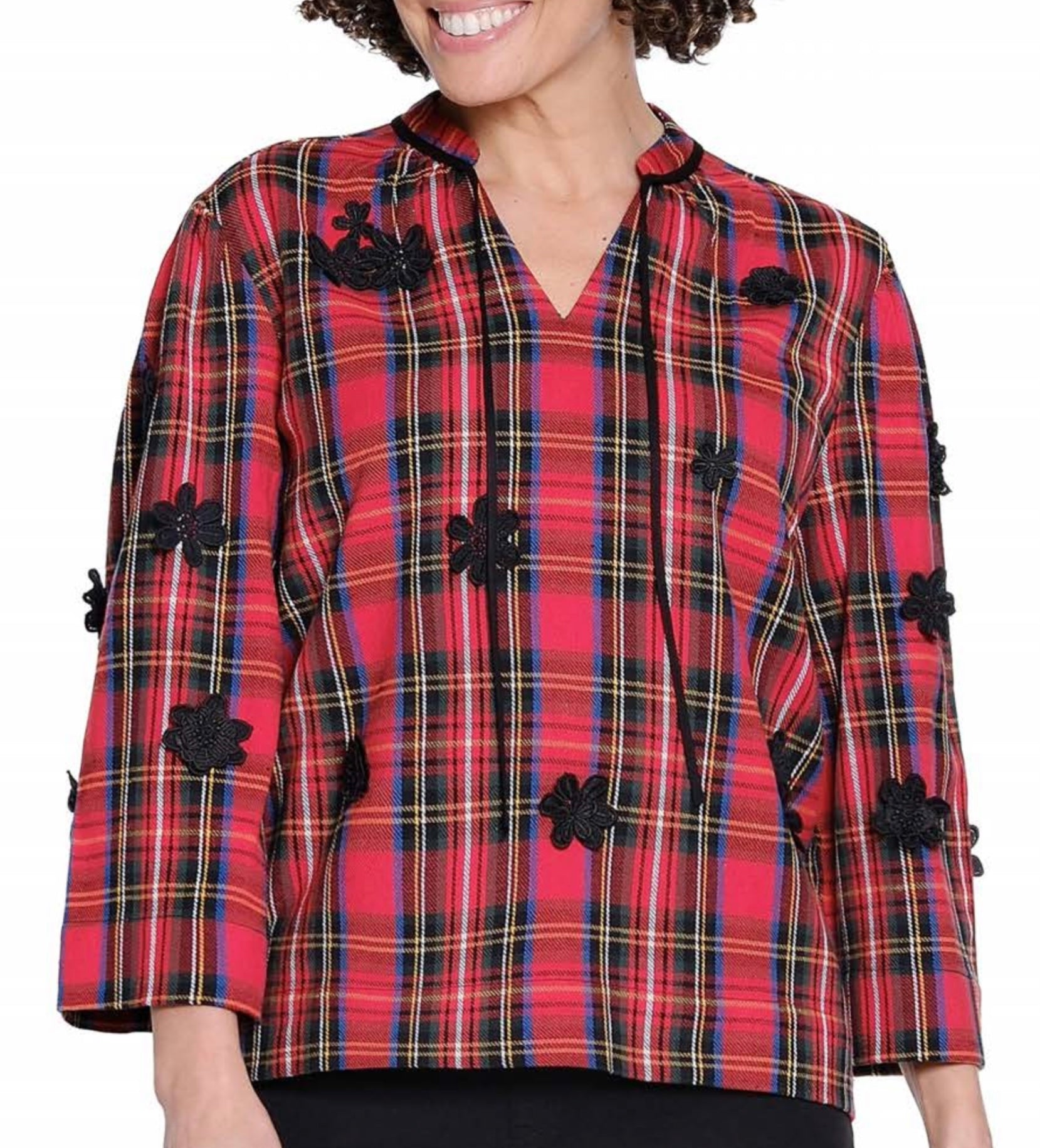 Embrace festive charm with this red plaid top featuring delicate black floral accents on the sleeves. Perfect for holiday gatherings, it blends classic patterns with subtle detailing for a look that’s both cozy and stylish. Elevate your seasonal wardrobe with this standout piece that offers warmth and elegance in one.