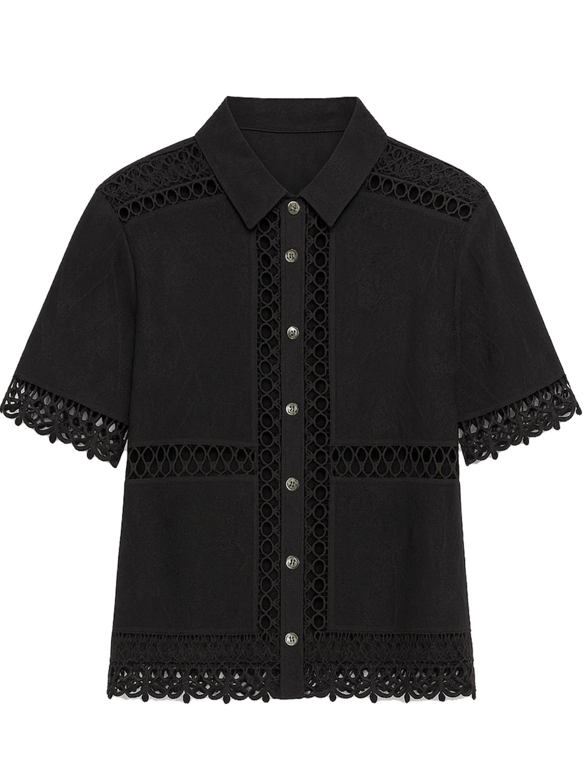 The Ruby Blouse combines timeless elegance with modern flair. This black button-up features delicate crochet detailing that adds texture and sophistication to your everyday wardrobe. The short sleeves offer breathable comfort for year-round wear, while the structured fit flatters any silhouette. Perfect for dressing up or down, this versatile piece transitions seamlessly from office to weekend. Invest in a blouse that works as hard as you do.