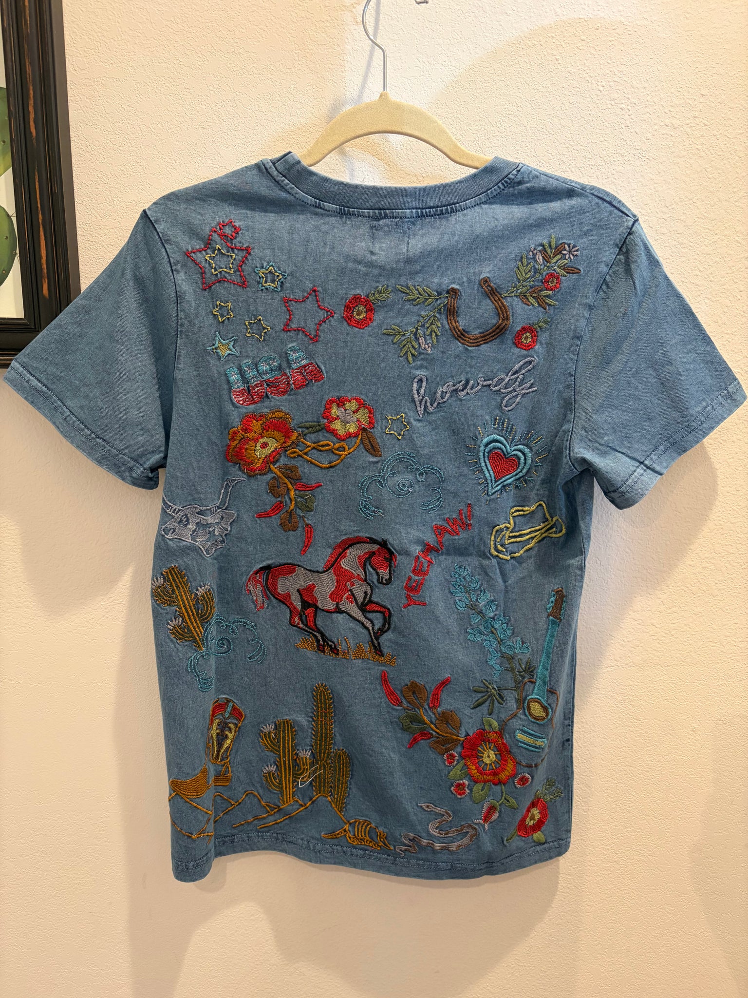 Howdy, partner! This classic short-sleeve tee features eye-catching embroidery on both the front and back, making it a standout piece for any wardrobe. Perfect for casual outings, weekend hangouts, or laid-back days at home, this versatile tee pairs effortlessly with jeans, shorts, or your favorite bottoms. The quality embroidery adds personality and charm while maintaining comfort for all-day wear. Whether you're embracing Western vibes or simply want a conversation-starting shirt, this Howdy Tee delivers style that speaks for itself.