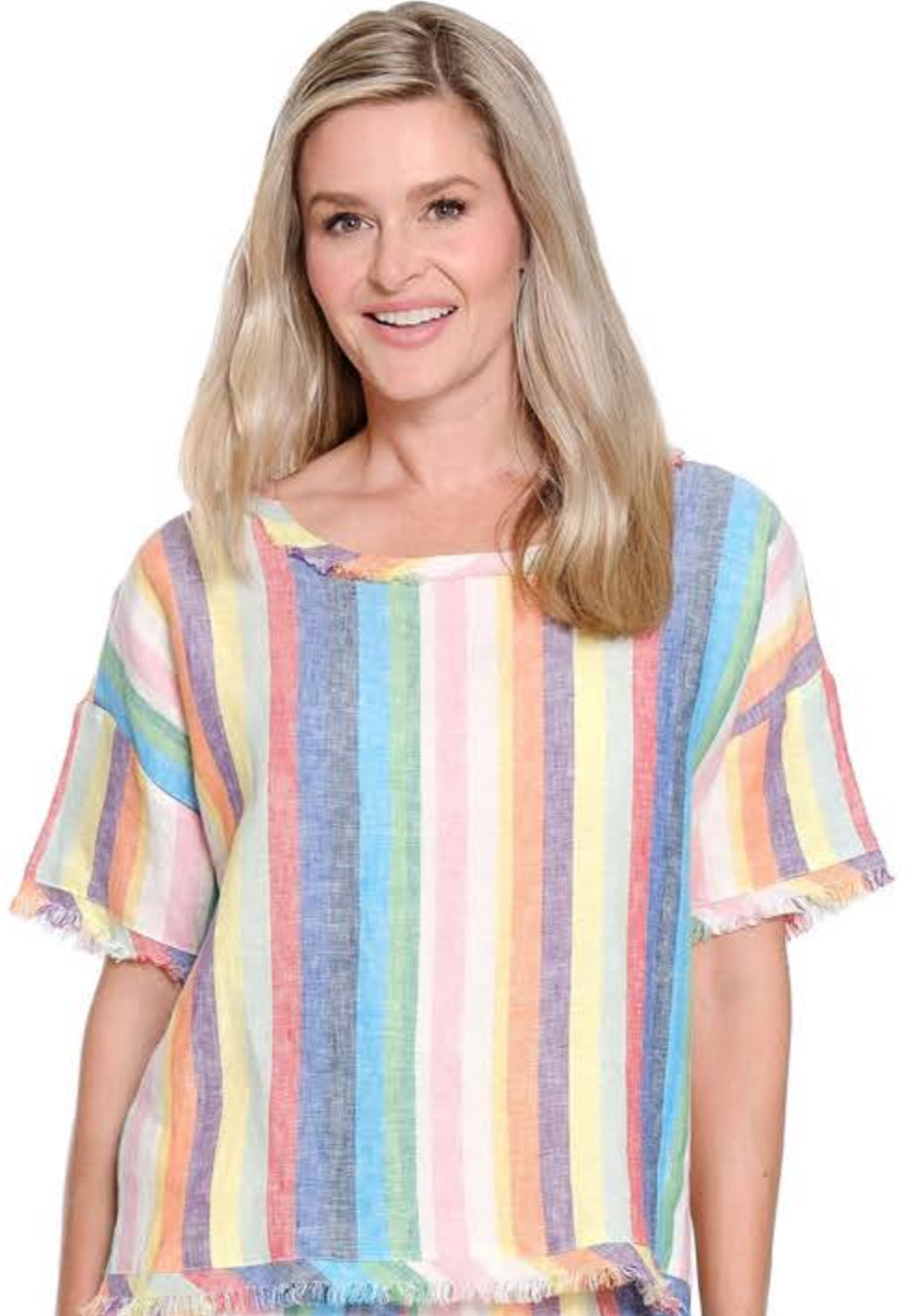 Effortless spring and summer style meets playful detail in this striped boxy top. The relaxed, oversized silhouette pairs perfectly with shorts, white jeans, or your favorite casual bottoms. Charming frayed edges at the cuffs add a cute, lived-in touch that feels fresh and intentional. Colorful stripes keep things vibrant and versatile—easy to dress up or down.