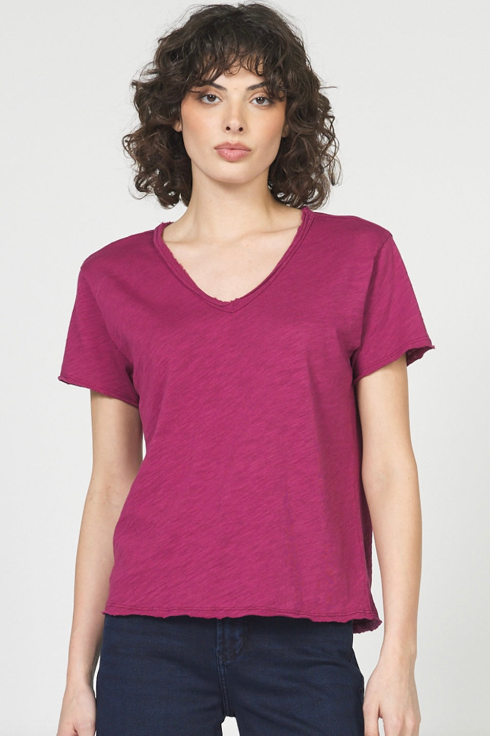 The Vanya Short Sleeve Tee in a rich wine maroon shade adds a stylish touch to your everyday wardrobe. Crafted for comfort and versatility, this tee pairs effortlessly with any outfit, making it your go-to choice for daily wear. Its flattering fit and deep color keep you looking polished, whether you're out running errands or meeting friends. Elevate your casual look with this must-have staple.